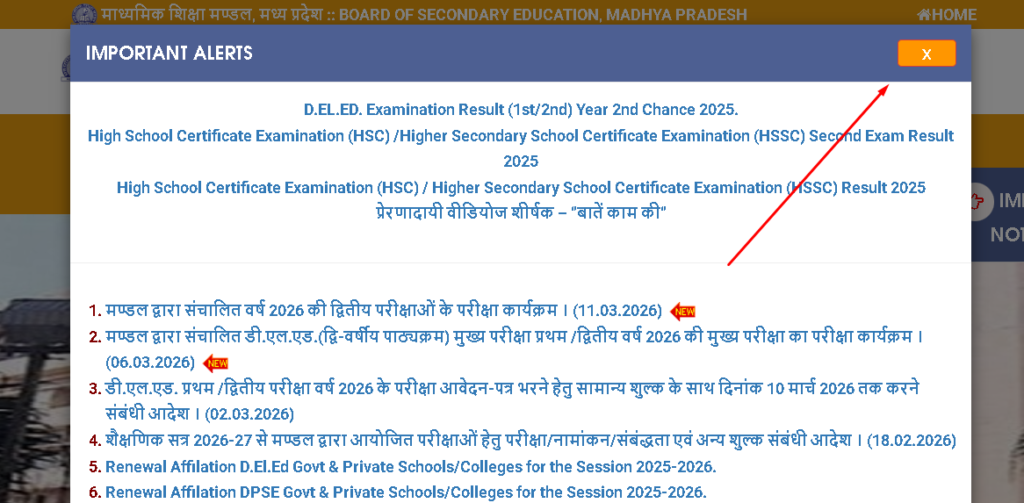2026 की मध्य प्रदेश 12वीं तथा दसवीं कक्षा की परीक्षा 10 फरवरी से शुरू हुई थी और 7 मार्च को समाप्त हो गई है। दसवीं कक्षा की परीक्षा का समय सुबह से दोपहर तक था और 12वीं कक्षा की परीक्षा का समय दोपहर से शाम तक था।