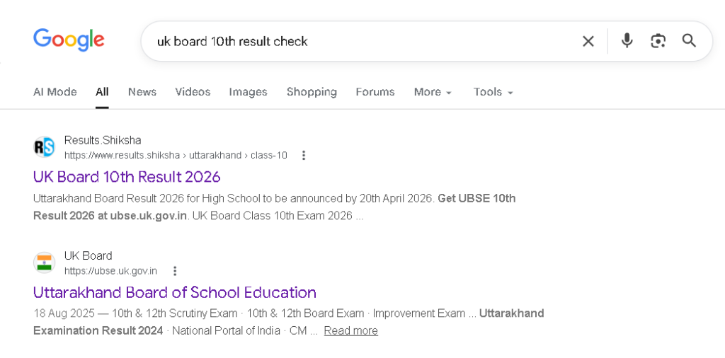 उत्तराखंड बोर्ड का दसवीं कक्षा का रिजल्ट चेक करने के लिए सबसे पहले आपको गूगल पर आना है गूगल पर आने के बाद UK Board 10th Result Check लिखकर सर्च करना है और यहां पर जो सरकारी वेबसाइट दिखाई दे रही है इस वेबसाइट को क्लिक करके ओपन कर लेना है।