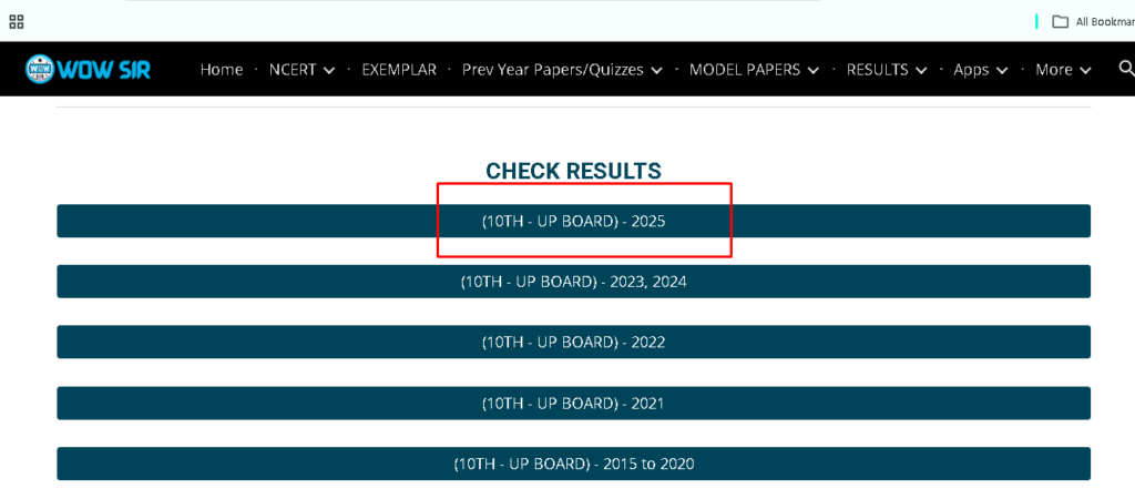 wowsir.in वेबसाइट पर आने के बाद सभी कक्षा का रिजल्ट चेक करने का यहां पर आपको लिंक मिल जाएगा हमें दसवीं कक्षा का रिजल्ट चेक करना है तो 10th UP board 2025 लिंक पर क्लिक कर दें।
